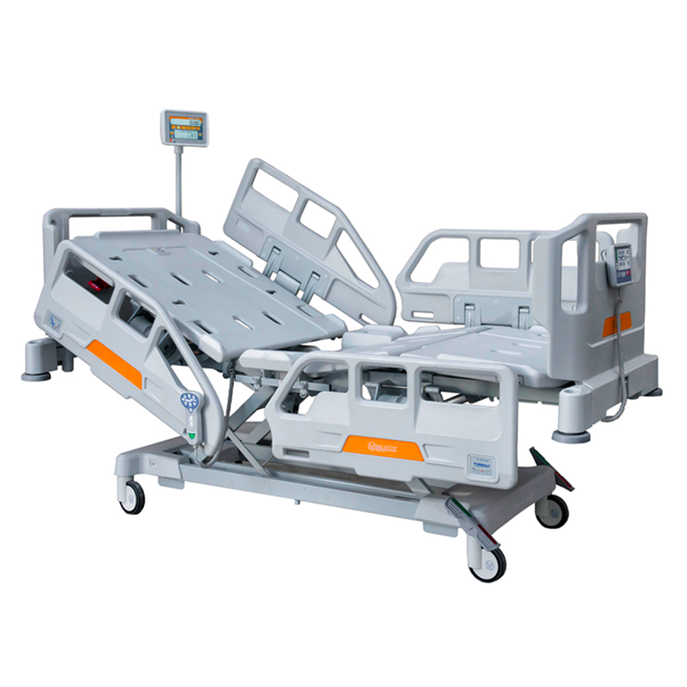 Letto bilancia con visore completo di programma dedicato; movimentabile elettricamente tramite due pulsantiere; piano rete ABS allungabile; schienale con sistema incentro; struttura verniciata con antibatterico; ruote con sistema frenante.